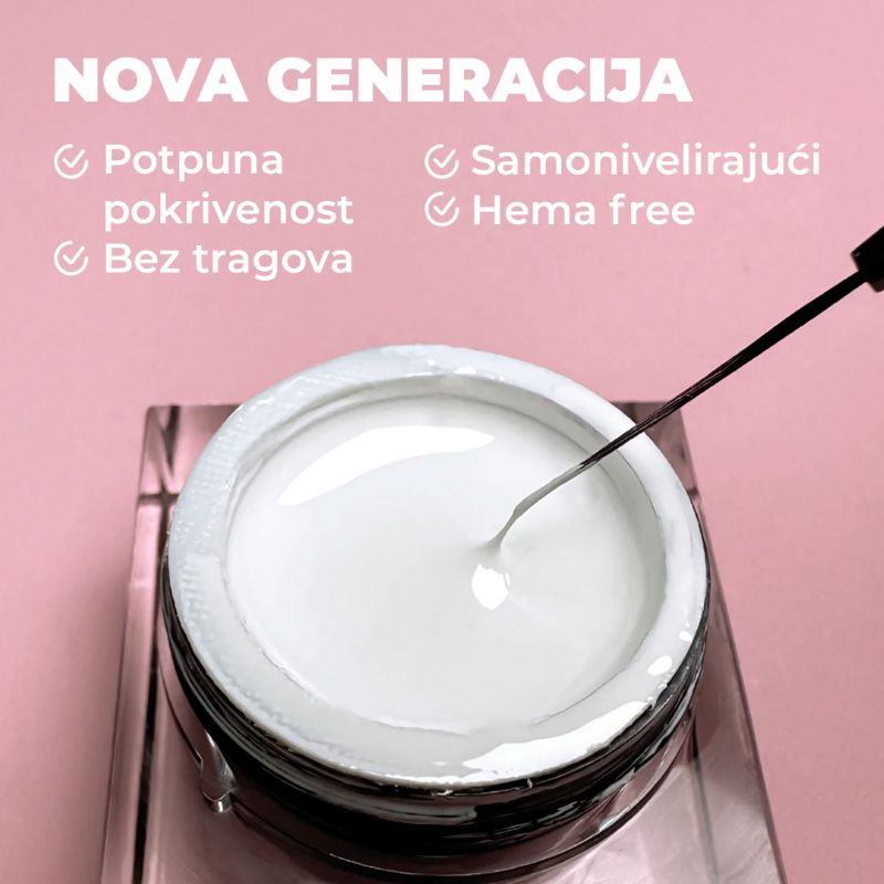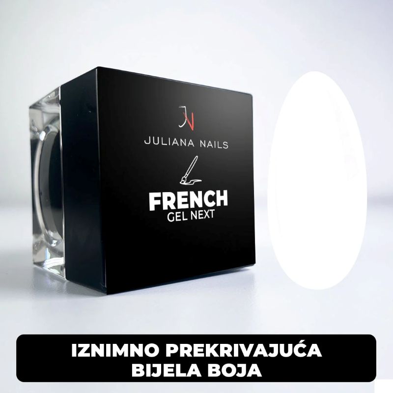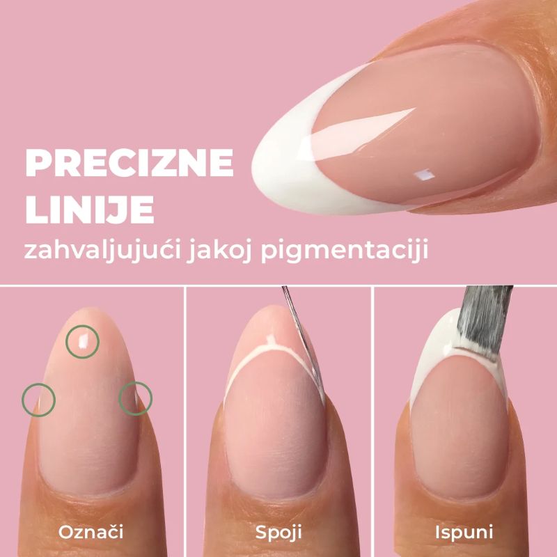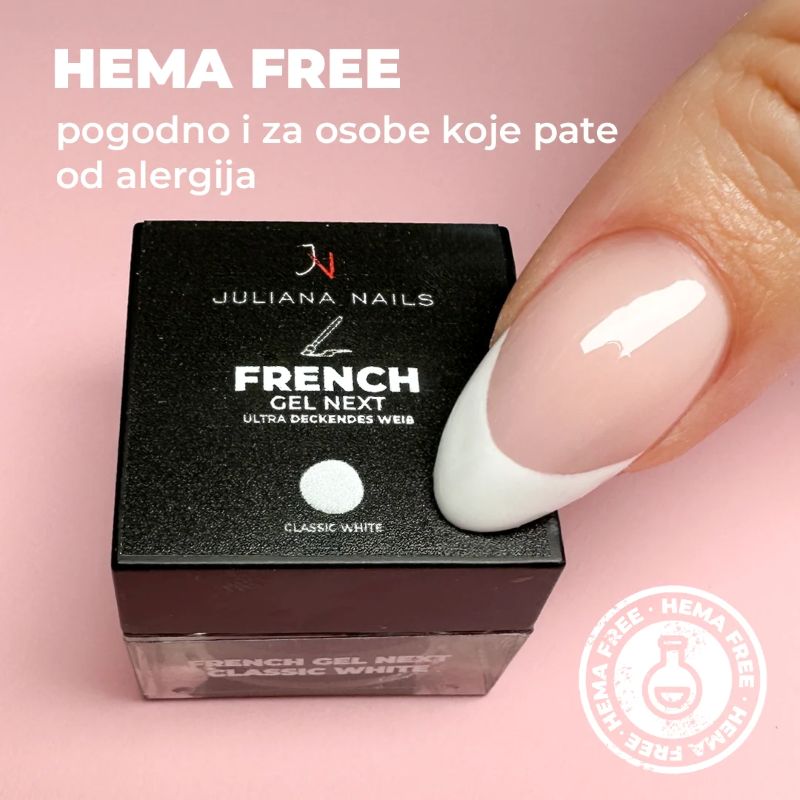 Naš French Gel Next objedinjuje sve što biste mogli poželjeti: mekanu, kremastu konzistenciju, savršenu pokrivenost i blagu HEMA-free formulaciju! Samoizravnavajuća formula osigurava da se gel samostalno zaglađuje, dajući vam apsolutno rezultate bez tragova. Jedva da ćete trebati dotjerivati, a svoju smile line možete izvesti čisto, precizno i bez ikakvog curenja. Ovaj gel je must-have za sve koji vole french nokte i žele još brže doći do savršenog rezultata.