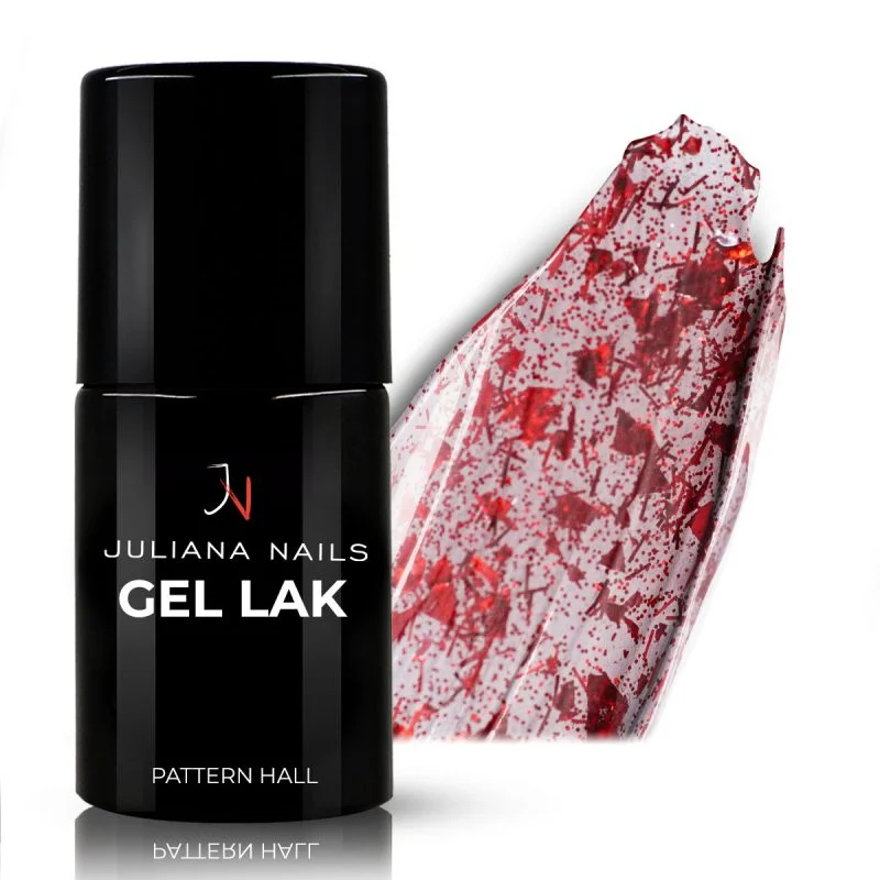 Gel lak Pattern Hall je proziran s crvenim komadićima folije, nitima i šljokicama za razigran izgled.