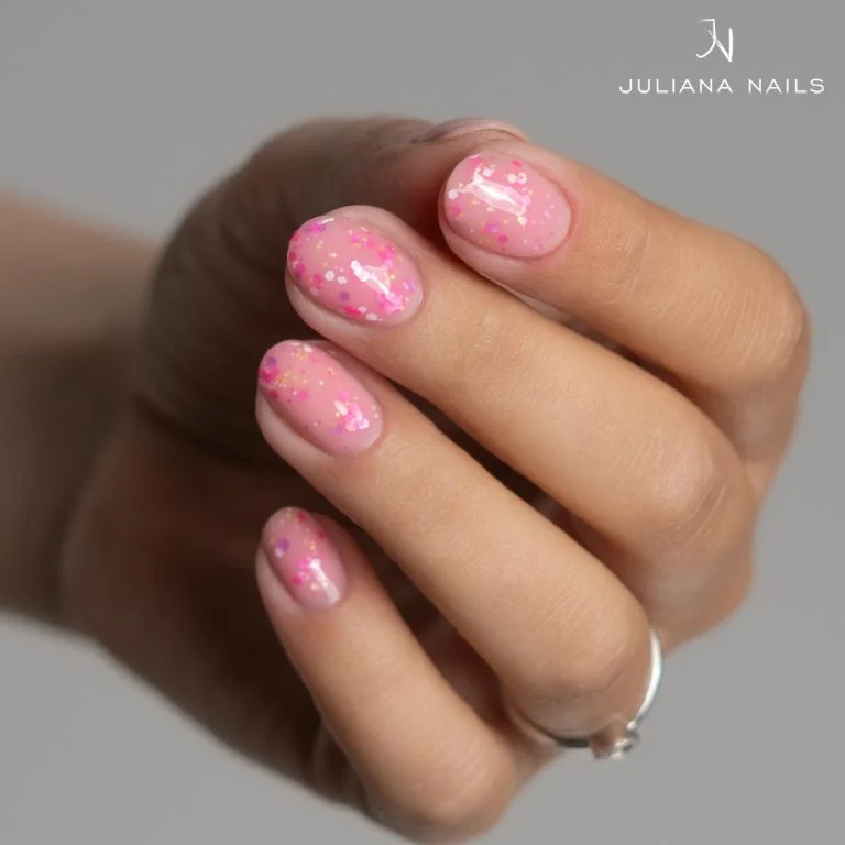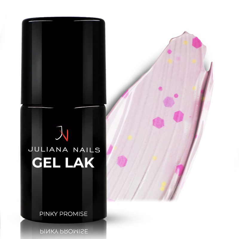 Naš gel lak Pinky Promise je prozirna roza boja s malim žutim točkicama i šljokicama u roza boji – slatka, šarmantna i jedinstvena.