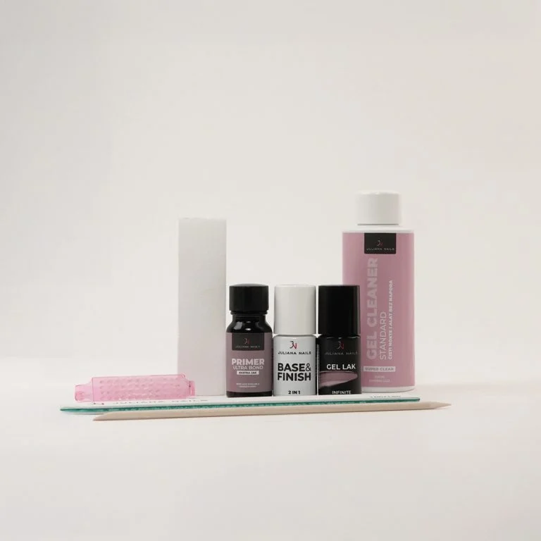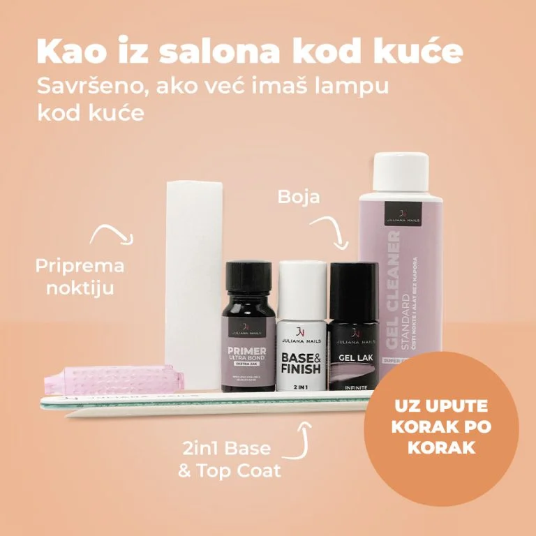 S ovim setom vrijeme je za savršene nokte u vašem domu. Sadrži sve osnovne proizvode koji su vam potrebni za profesionalne manikure i pedikure s gel lakom kod kuće te proizvode za pripremu noktiju, bazu, završni sloj i boju. Set ne sadrži lampu.