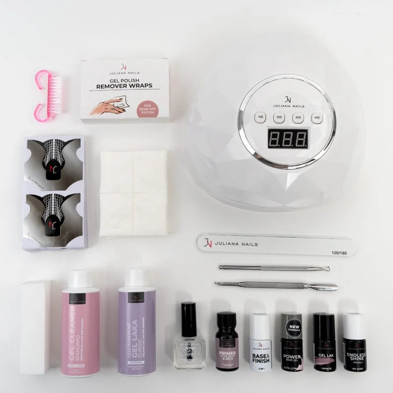 Gel Lak Set – Premium sadrži sve proizvode koji su vam potrebni za pripremu, nanošenje i uklanjanje gel laka, uključujući vrhunsku UV/LED lampu.