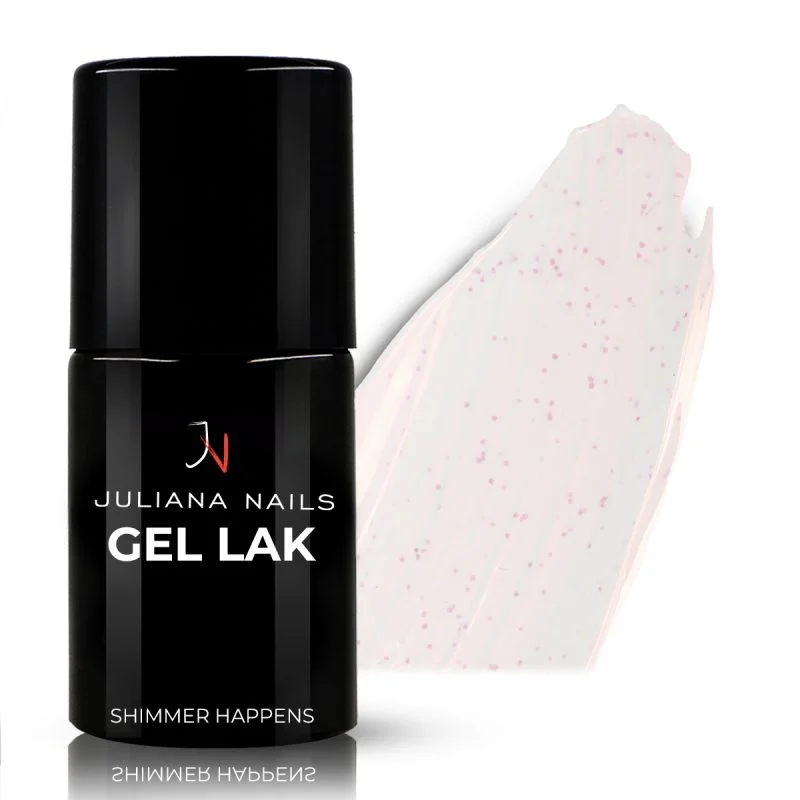Naš gel lak Shimmer Happens je mliječno bijele boje sa sitnim točkicama u roza, žutoj i plavoj boji – vrijeme je za prekrasne detalje.